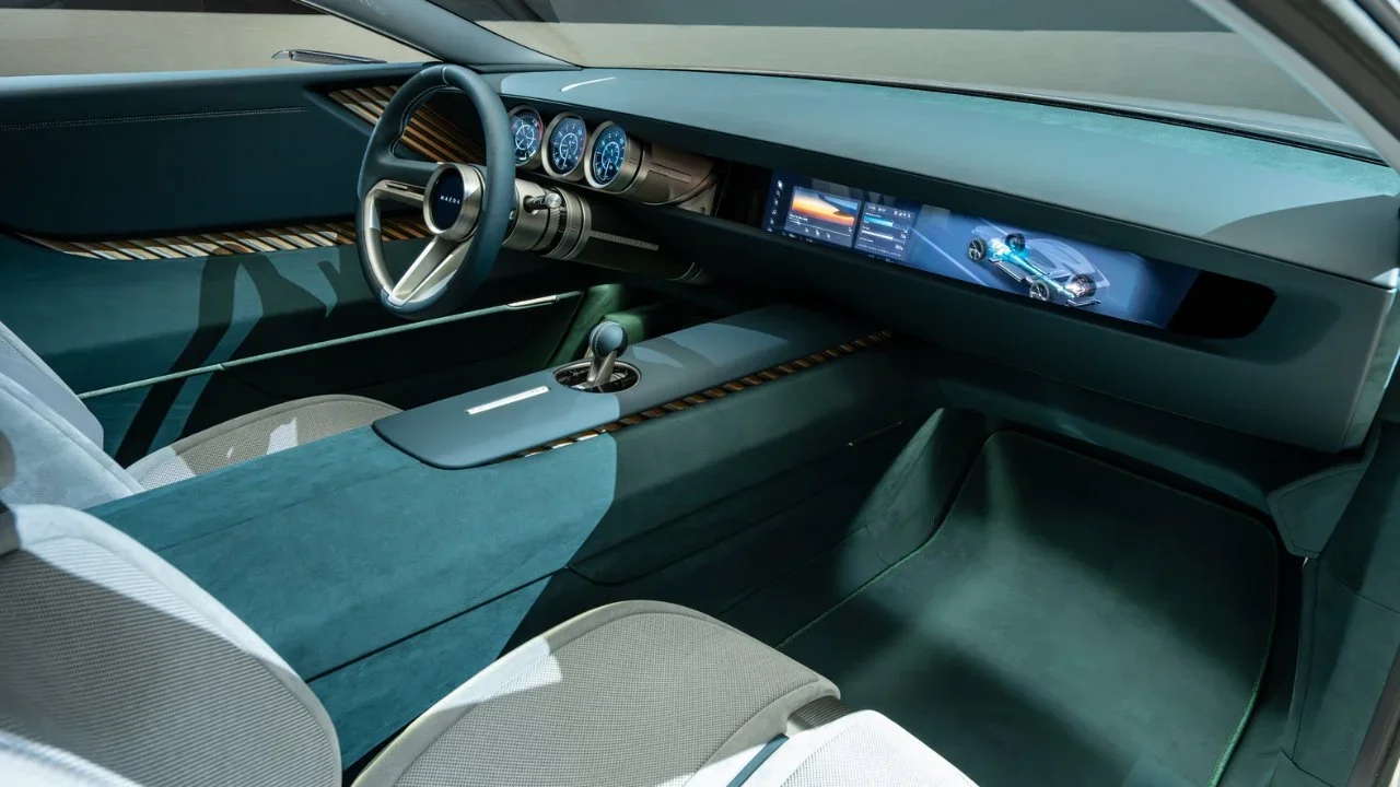 No pudimos ver bien el interior, pero lo que podemos ver es interesante. Es simple, lo cual me gusta. El conductor tiene un trío de indicadores digitales circulares, un cambio maravilloso frente a las gigantescas tabletas tipo ladrillo que infestan el tablero de cualquier otro auto nuevo. Pero luego, justo en la consola central, hay una palanca de cambios física y de la vieja escuela. ¿En un concepto híbrido enchufable para 2035? ¿Por qué? ¿Es para cambiar las marchas del rotativo? ¿El motor eléctrico tiene marchas? ¿O simplemente está ahí para darle a tu mano algo que hacer? No tiene sentido, y me encanta.