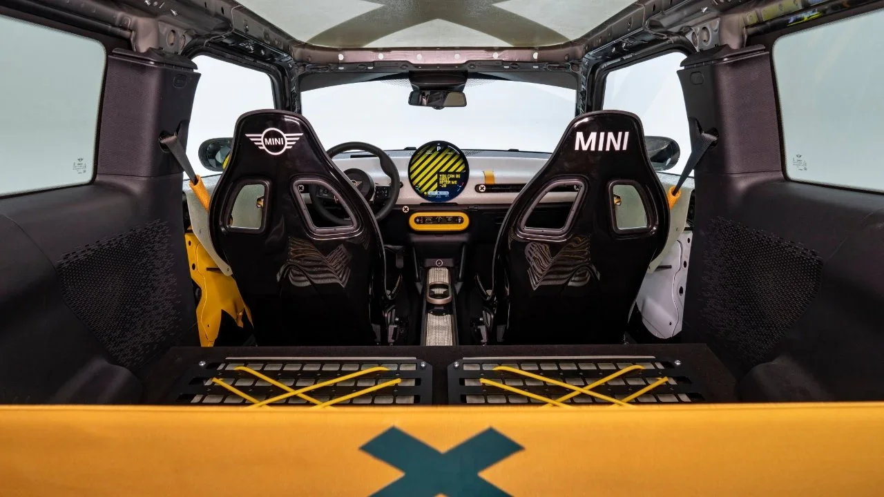 El eléctrico, brillantemente llamado 'Skeg', es el que realmente te atrapa. Está basado en el nuevo MINI John Cooper Works eléctrico, pero ha sido sometido a una dieta muy seria. Han mandado a volar un montón de acero y aluminio y lo han reemplazado con fibra de vidrio ligera.