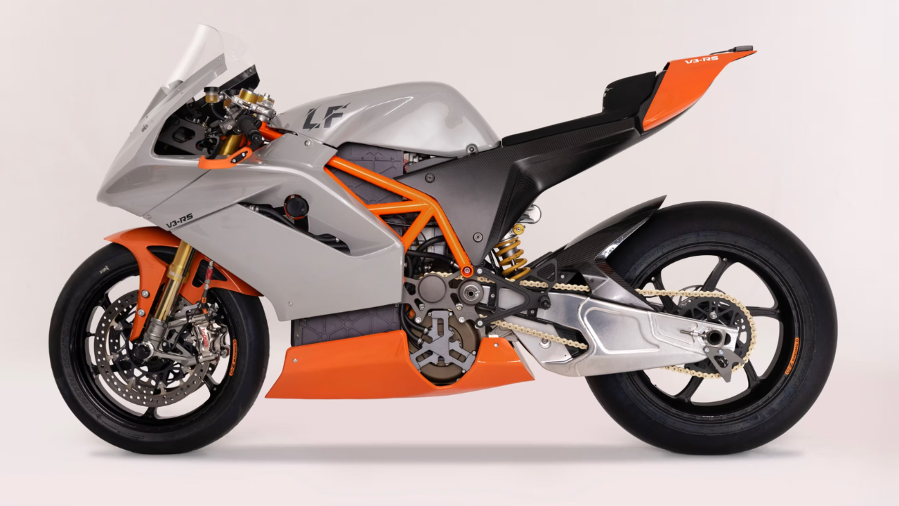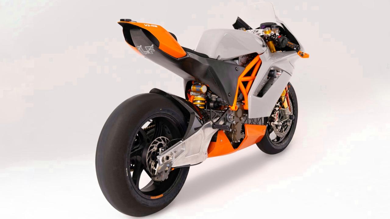 Primero está la que casi podría engañarte a simple vista, la V3-RS, vestida con un elegante traje de superdeportiva de carenado completo. Dentro de esa carrocería agresiva se esconde un chasis multitubular de cromolio personalizado, combinado con algunos de los mejores componentes que el dinero puede comprar. Estamos hablando de suspensión Öhlins adelante y atrás, y frenos Brembo que probablemente podrían detener un tren de carga. Esta es una supermoto en toda regla.
