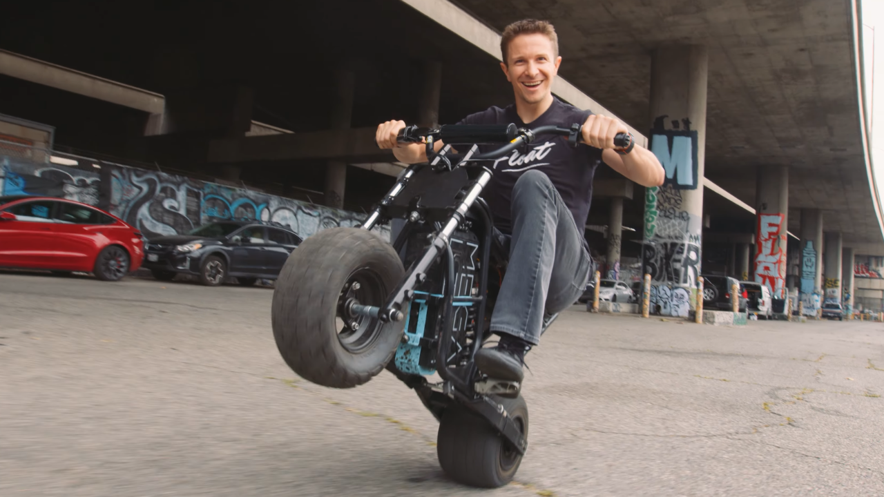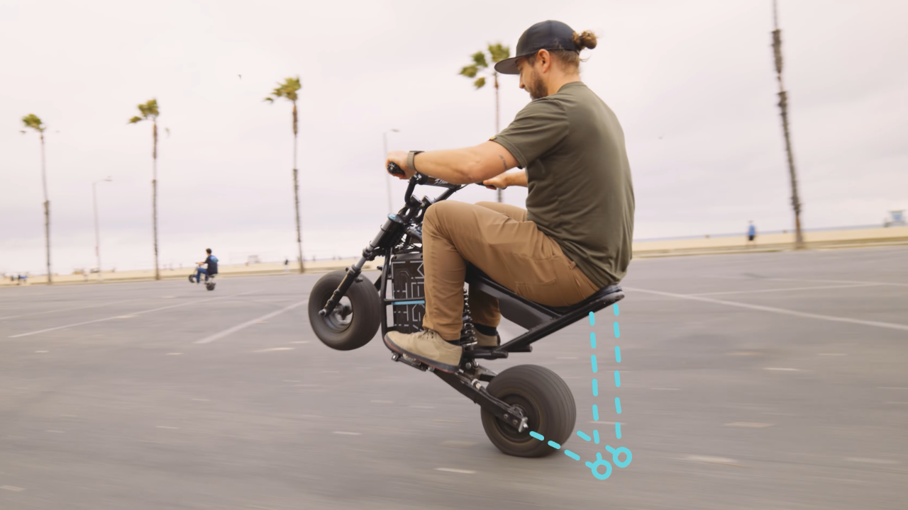 Ideada por un tipo llamado Jeff McCosker, este pequeño diablillo eléctrico promete convertir a cualquiera en un virtuoso de los caballitos. El secreto está en sus dos características principales. Primero, la estrella del espectáculo: el botón "Push To Wheelie" (Presiona para hacer un caballito). Lo presionas, lo mantienes apretado y la moto simplemente lo hace. Una vez que la rueda está en el aire, opera con un sistema de autoequilibrio. Inclínate hacia adelante para ir más rápido, inclínate hacia atrás para reducir la velocidad. Todo es muy futurista y suena sospechosamente fácil.